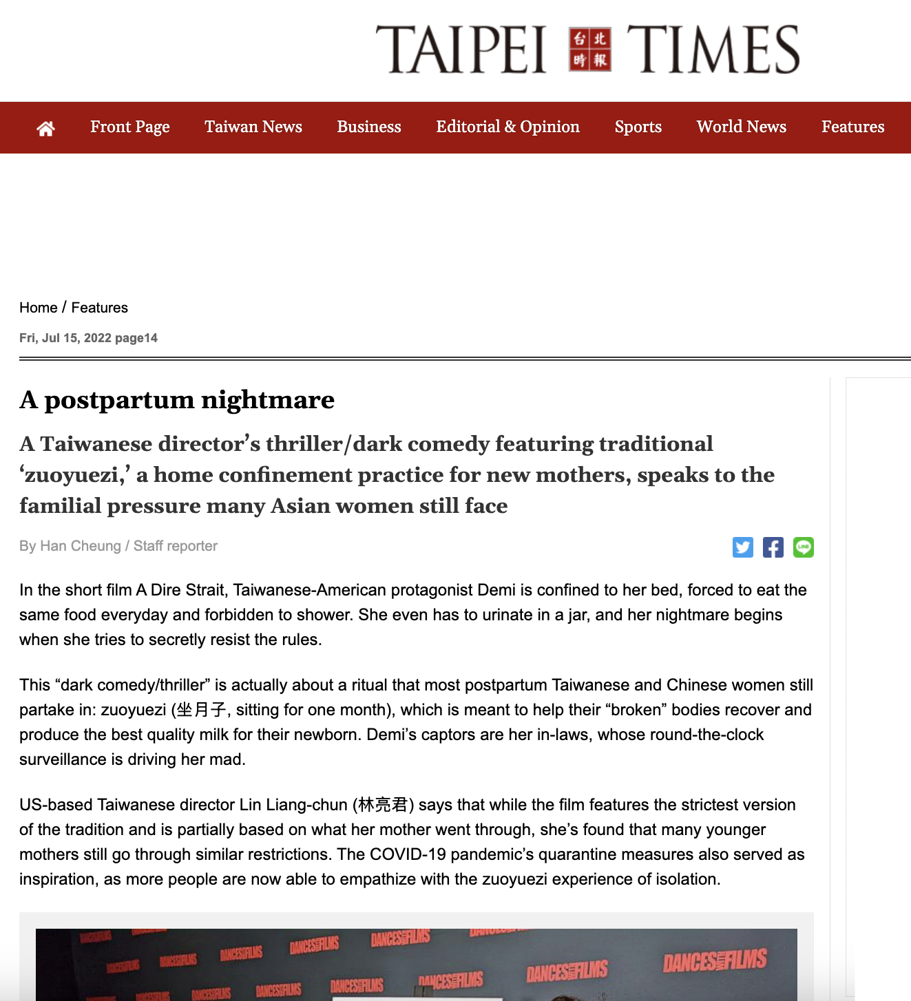 US-based Taiwanese director Lin Liang-chun (林亮君) says that while the film features the strictest version of the tradition and is partially based on what her mother went through, she's found that many younger mothers still go through similar restrictions. The COVID-19 pandemic's quarantine measures also served as inspiration, as more people are now able to empathize with the zuoyuezi experience of isolation.... HERE FOR THE FULL ARTICLE.